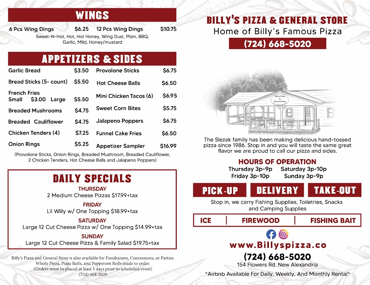 Welcome to Billy's Pizza & General Store (formerly known as Billy's Pizza Shack), a delightful gem nestled at 154 Flowers Rd, New Alexandria, PA 15670. This establishment has quickly become a favorite among locals and visitors alike, offering not just delicious pizza but also a taste of nostalgia and community charm.